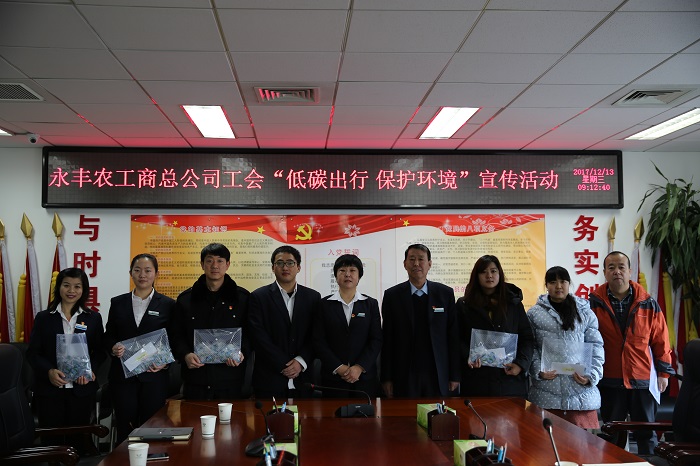 為充分發(fā)揮工會聯(lián)系黨與群眾的橋梁作用,進一步加強總公司工會建設(shè)。2017年12月13日,永豐農(nóng)工商總公司工會將現(xiàn)階段工會建設(shè)與北京市秋冬季環(huán)境保護和空氣治理工作相結(jié)合,旨在宣傳環(huán)境保護意識,提倡綠色出行理念。在總公司207會議室組織召開了主題為“低碳出行 保護環(huán)境”宣傳活動??偣军h總支部副書記劉迎春、總公司工會主席郭東升及各二級公司工會負責人參加了此次活動。